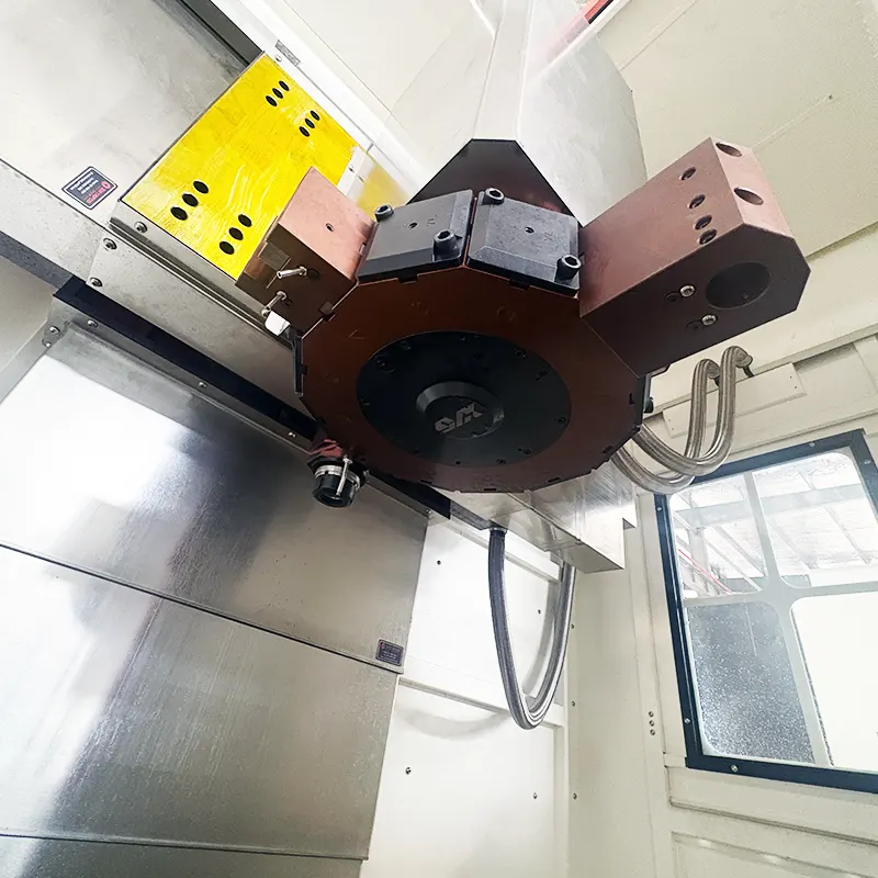 The pulley of the main shaft of the machine tool and the pulley of the CNC servo motor of the spindle are linked by a belt, equipped with a high-torque servo motor, stepless speed change, and a wide speed range. Meet the different requirements of the rough machining and finishing machining of the parts on the spindle speed. The tool holder of the machine tool adopts horizontal or vertical multi-station CNC tool holder, which shortens the tool change time and greatly improves the work efficiency. The live tool turret can be selected according to customer needs to realize the functions of milling, drilling and tapping. The upper end of the spindle can be equipped with a disc-type worktable or a hydraulic chuck according to customer requirements. The lower end of the spindle is equipped with a single-piston cylinder or a double-piston cylinder, which is used to control the pressing of the workpiece and the hydraulic chuck.