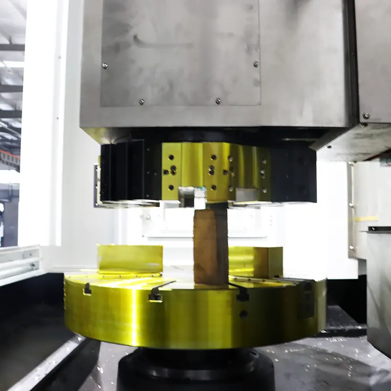 The pulley of the main shaft of the machine tool and the pulley of the CNC servo motor of the spindle are linked by a belt, equipped with a high-torque servo motor, stepless speed change, and a wide speed range. Meet the different requirements of the rough machining and finishing machining of the parts on the spindle speed. The tool holder of the machine tool adopts horizontal or vertical multi-station CNC tool holder, which shortens the tool change time and greatly improves the work efficiency. The live tool turret can be selected according to customer needs to realize the functions of milling, drilling and tapping. The upper end of the spindle can be equipped with a disc-type worktable or a hydraulic chuck according to customer requirements. The lower end of the spindle is equipped with a single-piston cylinder or a double-piston cylinder, which is used to control the pressing of the workpiece and the hydraulic chuck.